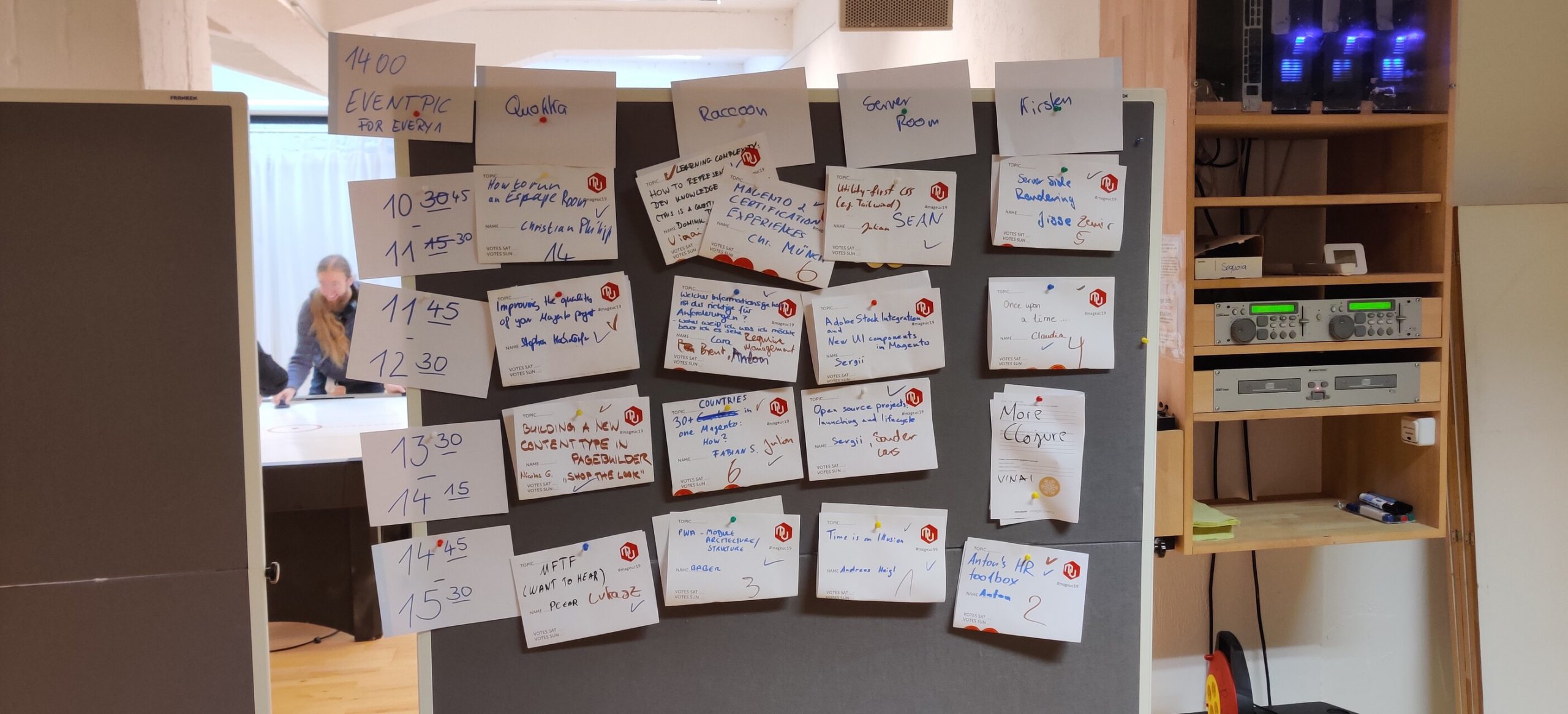 Wir versuchten so wenig wie möglich zu stören. Wie Anfangs beschrieben wollte ich eigentlich eher weniger machen. Ich hatte mich einen Tag vorher zu einer Podiumsdiskussion zum Thema Magento 1 End of Life angemeldet und selbst keine Folien oder Material vorbereitet. Mein Plan fand ein schnelles Ende. Fabian nahm mich direkt zu Seite und bat mich in in seiner unnachahmlichen Art einfach ein paar Themen auf die Liste zu schreiben was ich dann auch gemacht hatte.